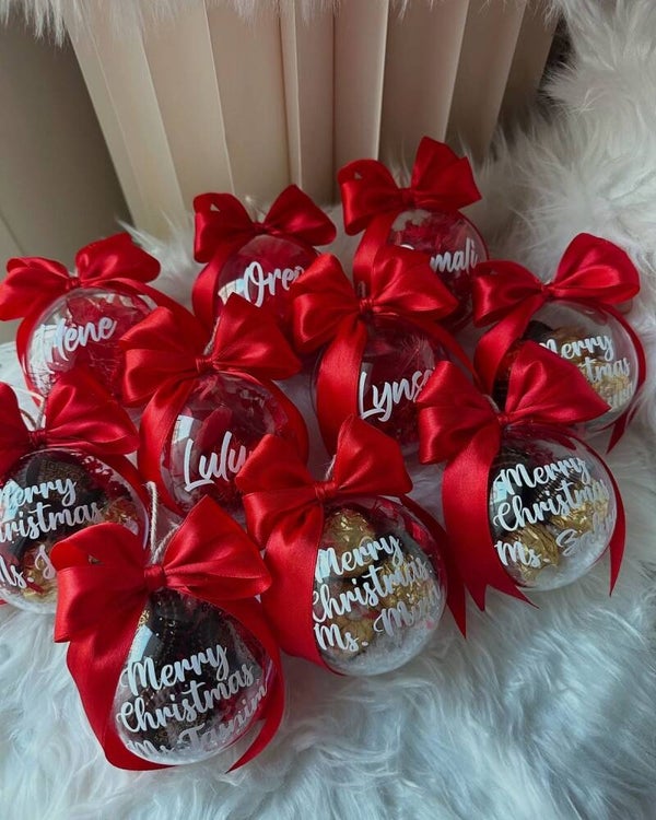 Sweeten your holidays with our personalized clear Christmas ornaments, filled with delicious chocolate candies and customized with your name or favorite word in elegant white vinyl. Each ornament is finished with a festive red satin bow, making it a perfect combination of elegance, sweetness, and Christmas spirit.