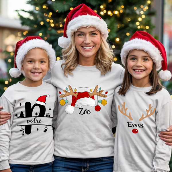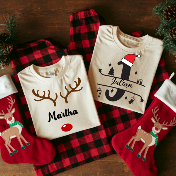 Each design features a unique festive illustration — from Santa hats to reindeer antlers — customized with your family members’ names to create the perfect matching holiday look.